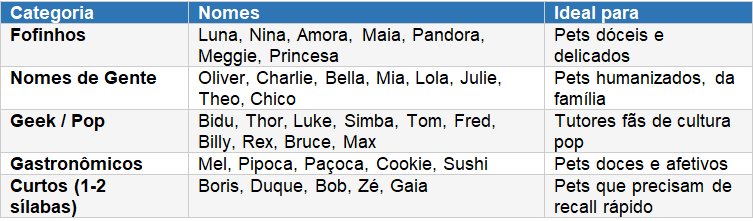 - Pense nos próximos 15 anos: Você vai chamar esse nome em situações sérias — veterinário, emergências. Certifique-se de que ele soa bem em qualquer contexto.